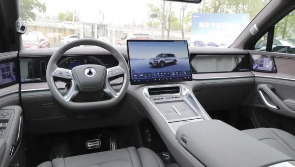 Архитектура передней панели типична для современных китайских автомобилей, но не обошлось без оригинальных решений. По центру установлен «парящий» сенсорный планшет мультимедийной системы, а для водителя и переднего пассажира предусмотрено еще по одному встроенному дисплею. На центральном тоннеле две площадки беспроводной зарядки для смартфона.