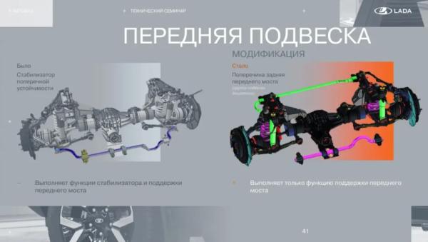 Стабилизатор поперечной устойчивости, ранее расположенный за передней осью, теперь перенесён в передний свес. Изменённые точки приложения сил должны улучшить управляемость, а исключение крепления к редуктору — уменьшить уровень вибраций.