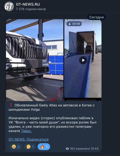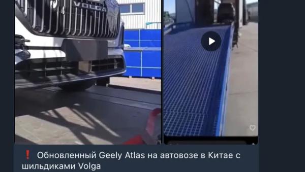 Паблик в VK «Волга — часть моей души» опубликовал видео (сторис) с автовозом обновленного Geely Atlas с шильдиком Volga. Но через время ролик был удален, уже повторно его разместил тг-канал «TAGAZ: Автожурнал». Ниже можете увидеть скриншоты из видео, а полностью мы его опубликовали в нашем телеграм-канале (вот тут), будем благодарны вашей подписке, ведь все новости в первую очередь выходят именно там. Причем эмблемы Volga не только на привычных местах (решетке радиатора и багажной двери), но и на колесных дисках.