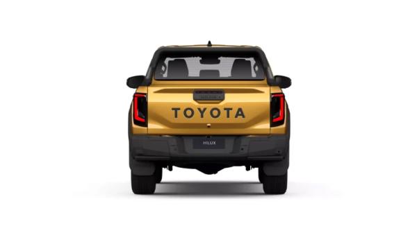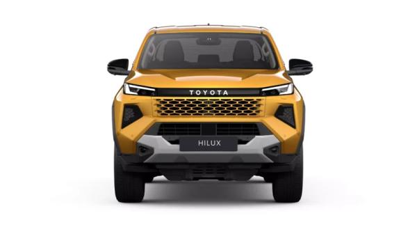 Если кузов остался прежним, то дизайн полностью перекроен: спереди Toyota Hiluxе 2026 выделяется безрамочной решеткой радиатора в цвет кузова и фарами в виде тонких полос, соединенных черной перемычкой с крупной надписью TOYOTA по центру.